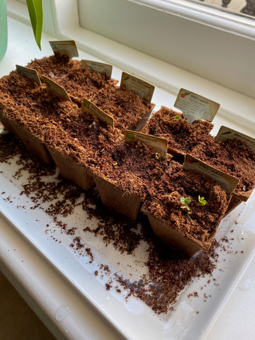 And so I found myself at the till of the local Marks & Spencers, packing up a huge shop. A friendly and patient young couple behind me in the queue struck up a conversation as I laboriously filled bags. "What's the occasion?" they asked. The UK government had yet to put stay-at-home orders in place so panic buying was not yet a thing. "Do you collect the seeds?" was their next question. I had no idea what they were talking about, I was food shopping not gardening. As I went to pay, I learned that M&S was running a lovely campaign for growing plants at home and was offering a free seed kit, complete with a little peat pot, compost and a pack of seeds, one free with every £25 spent in the shop. I went home with 10 of them.
